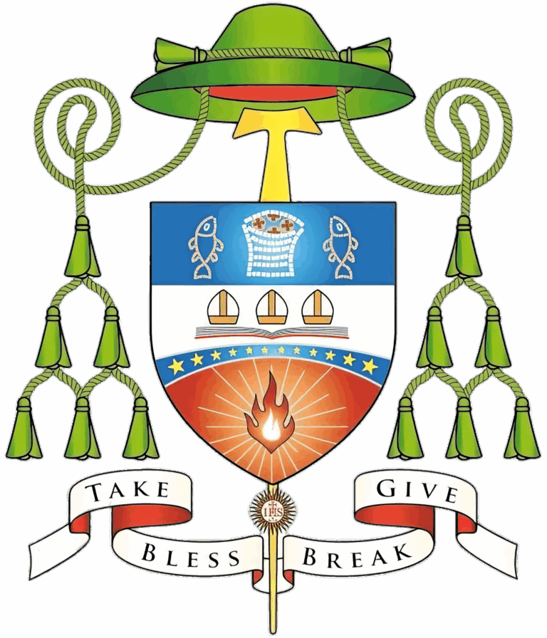 The three mitres on the top of a book is the symbol of St Bernard of Clairvaux, Bishop and Doctor of the Church after whom Bishop Bernard Paul is named. The three mitres signify the three times that St Bernard was approached to become a bishop and declined.